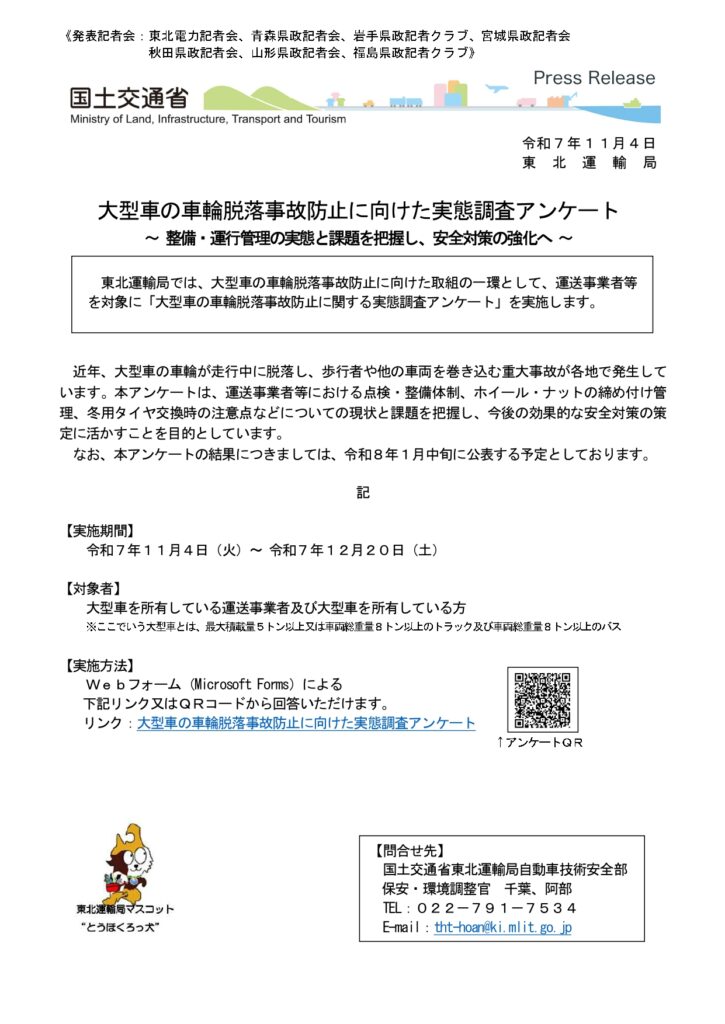 【東北運輸局】大型車の車輪脱落事故防止に向けた実態調査アンケートにご協力ください